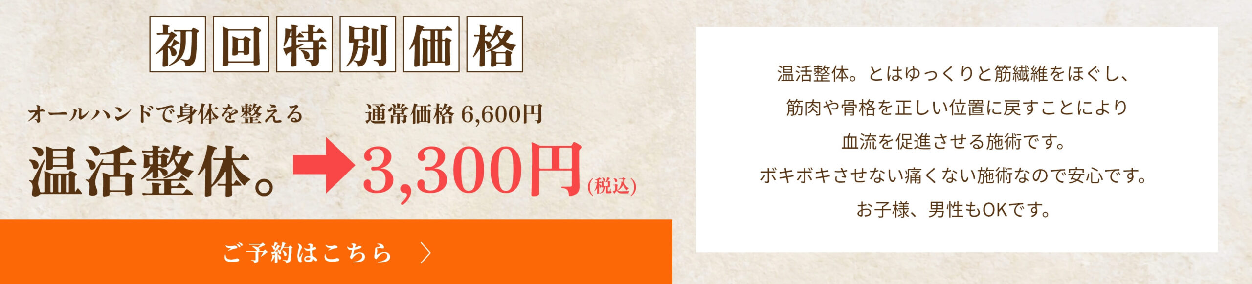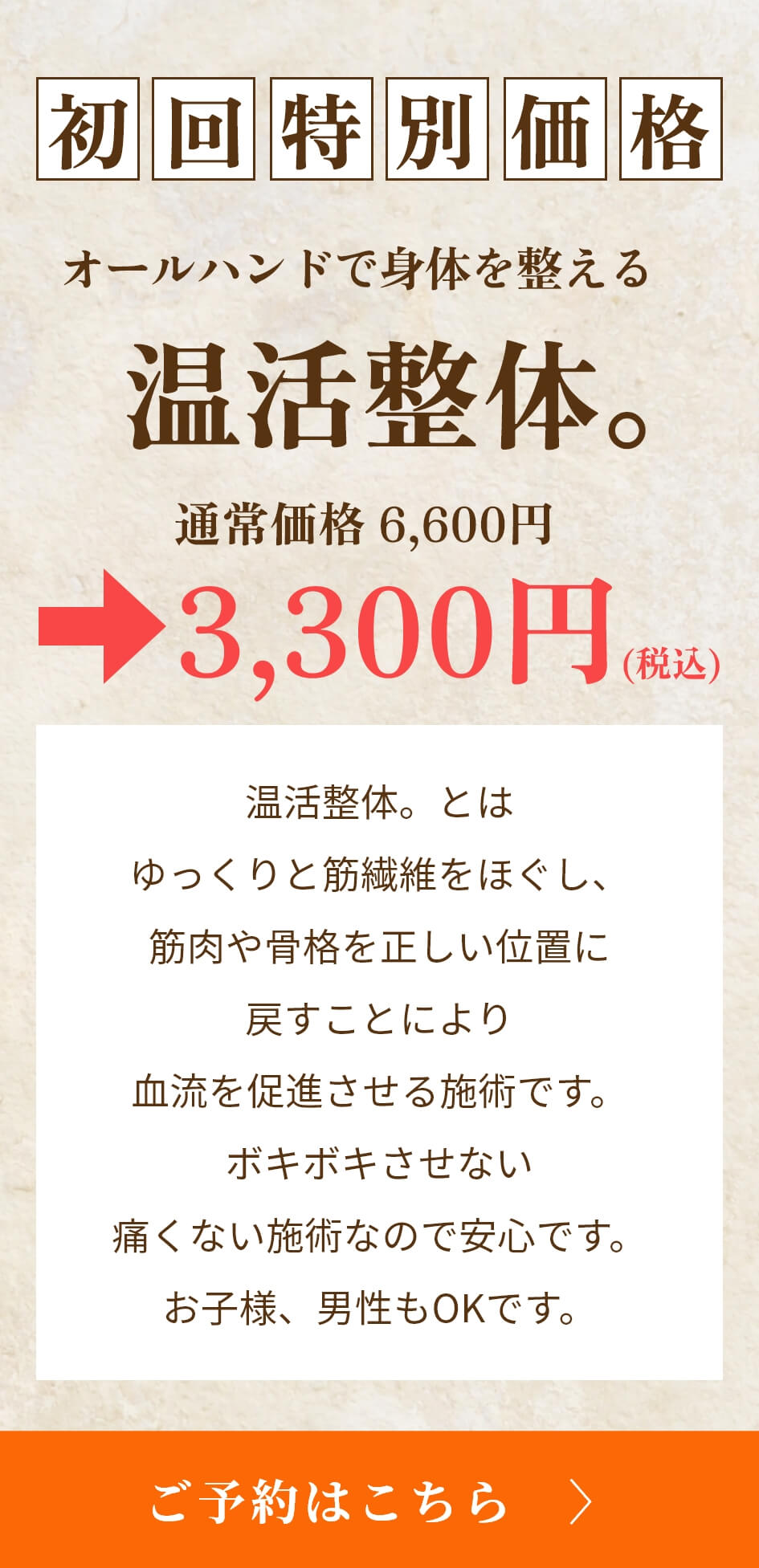 整体が初めての方や、どこに行けば良いか迷っている方も、ぜひ一度ご相談ください。初回は「 温活整体。」を半額でご利用いただけます!